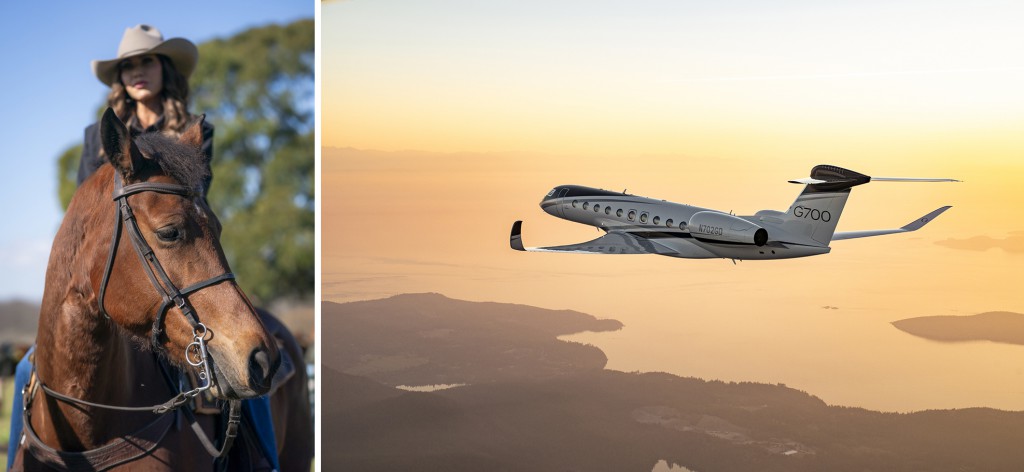 Photos: (Left) U.S. Department of Homeland Security (DHS) Secretary Kristi Noem participates in horseback riding with the Minister of National Security of Argentina Patricia Bullrich at Campo de Mayo in Buenos Aires, Argentina, July 28, 2025. Photo credit: DHS photo by Tia Dufour via Flickr. US government work. (Right) Gulfstream G700 jet. Photo credit: Gulfstream Aerospace Corporation. Democracy Now – October 21, 2025.