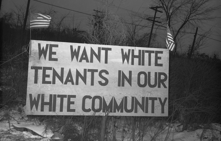 Photo: Sign in Detroit, Michigan - February 1942. A riot occurred at the Sojourner Truth homes when white neighbors' attempted...