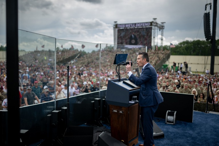 Photo: Secretary of Defense Pete Hegseth delivers remarks at Fort Bragg, North Carolina on Tuesday, June 10, 2025, during a...